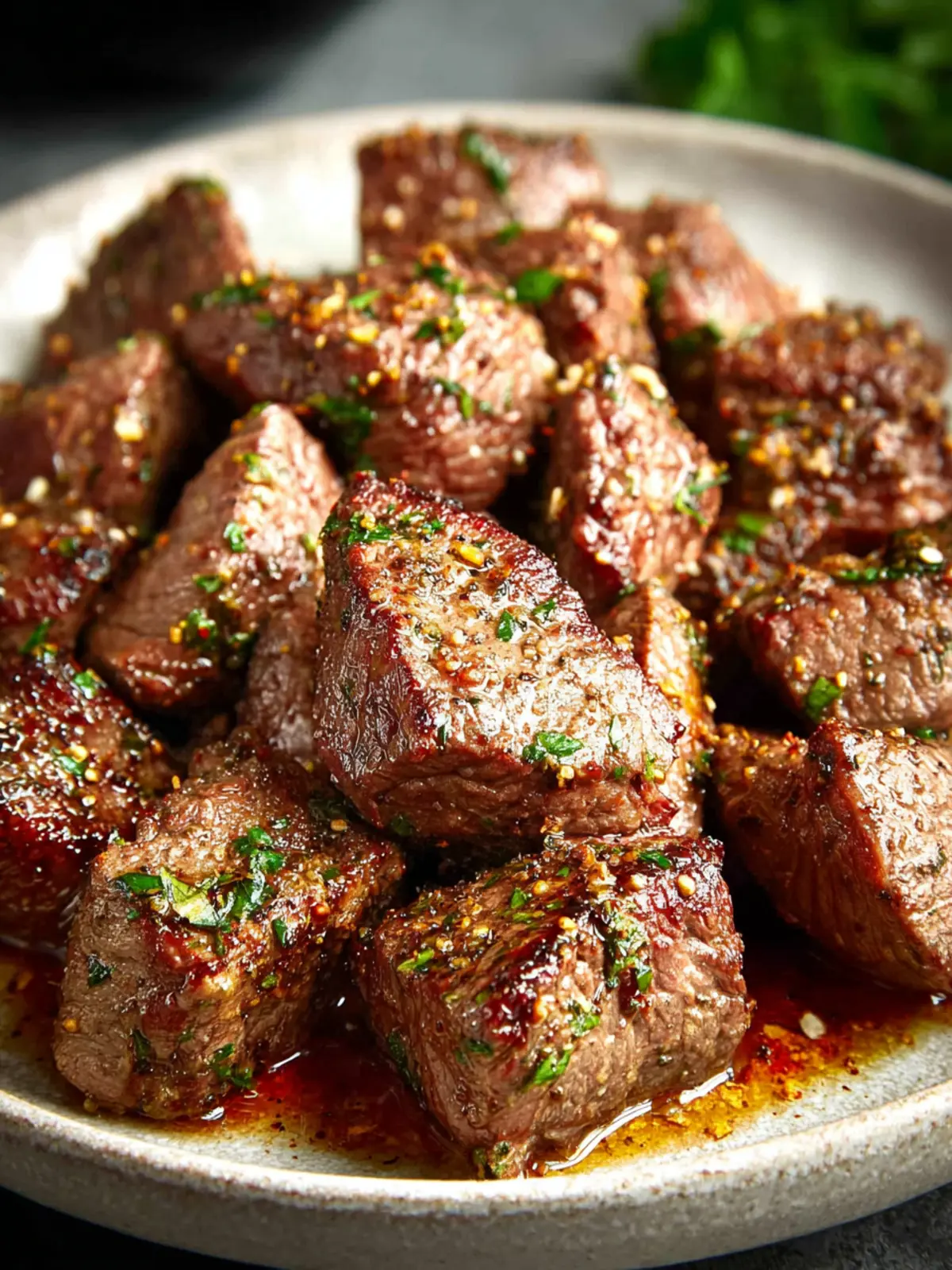 Delicious and juicy air-fried steak bites seasoned with garlic and spices.