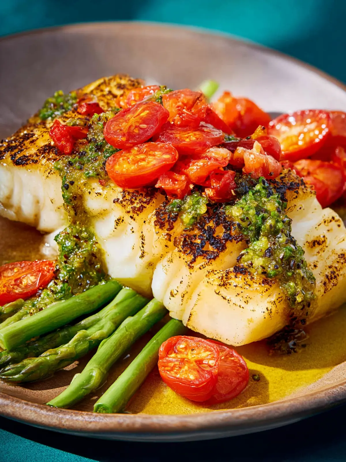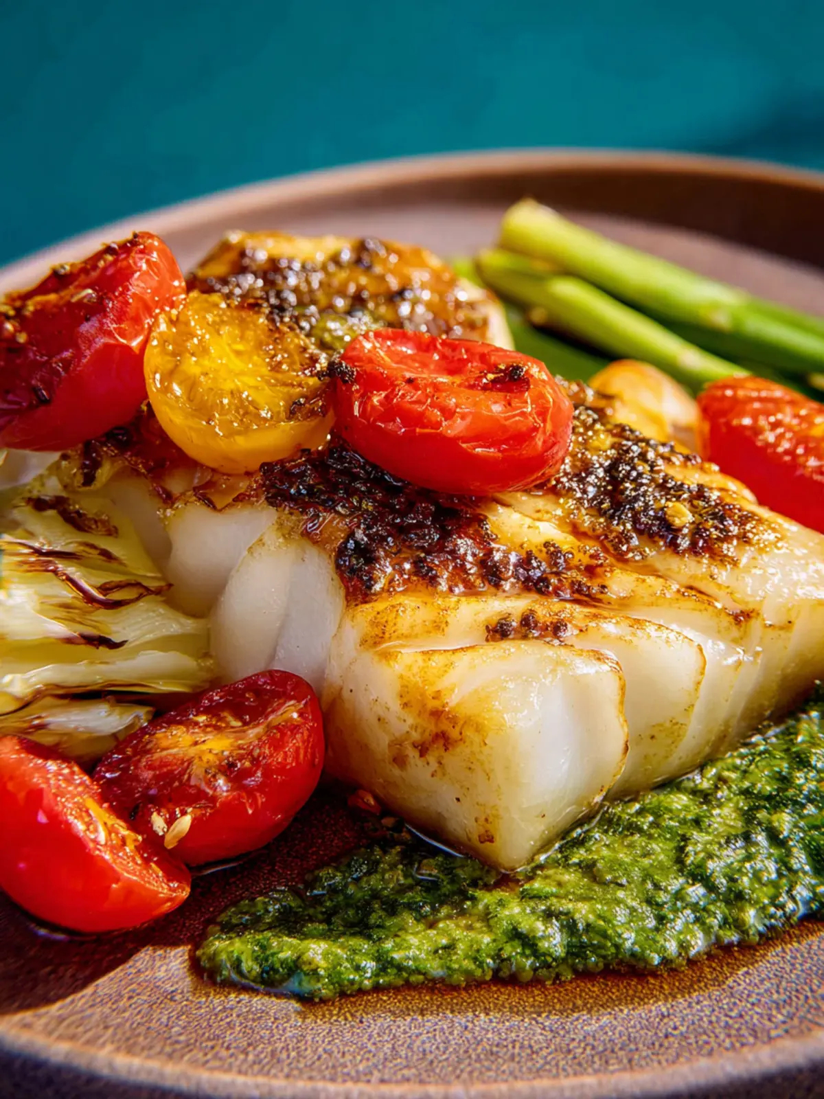 5. Finish and serve. When the fish is ready, remove it from the oven, uncover, and immediately squeeze one of the grilled lemon halves all over the fish. Spread the basil pesto on top. If using, toss the grape tomatoes with a pinch of salt and a drizzle of olive oil and arrange over the fish as a garnish. Serve immediately, with the remaining lemon on the side for squeezing.