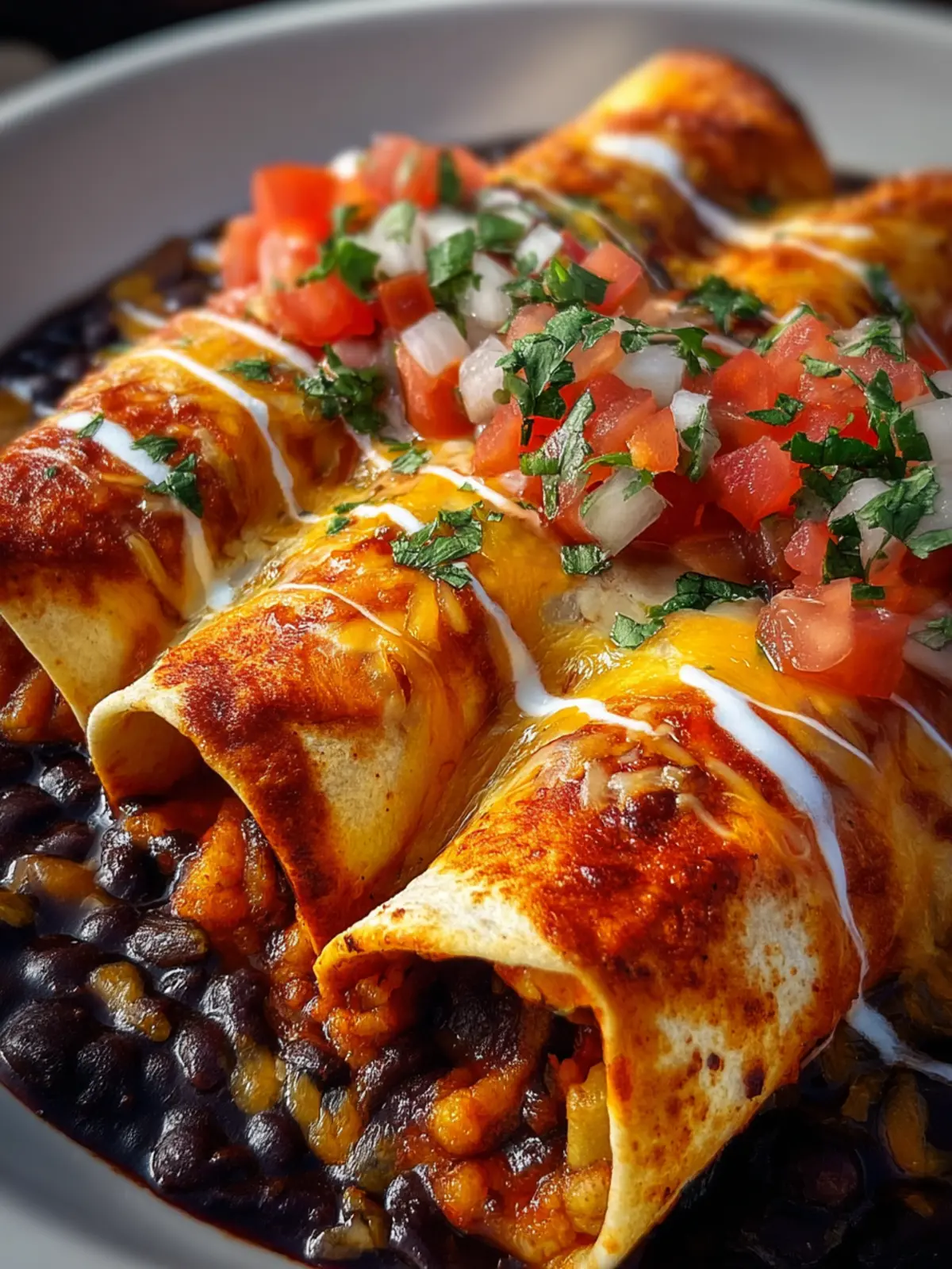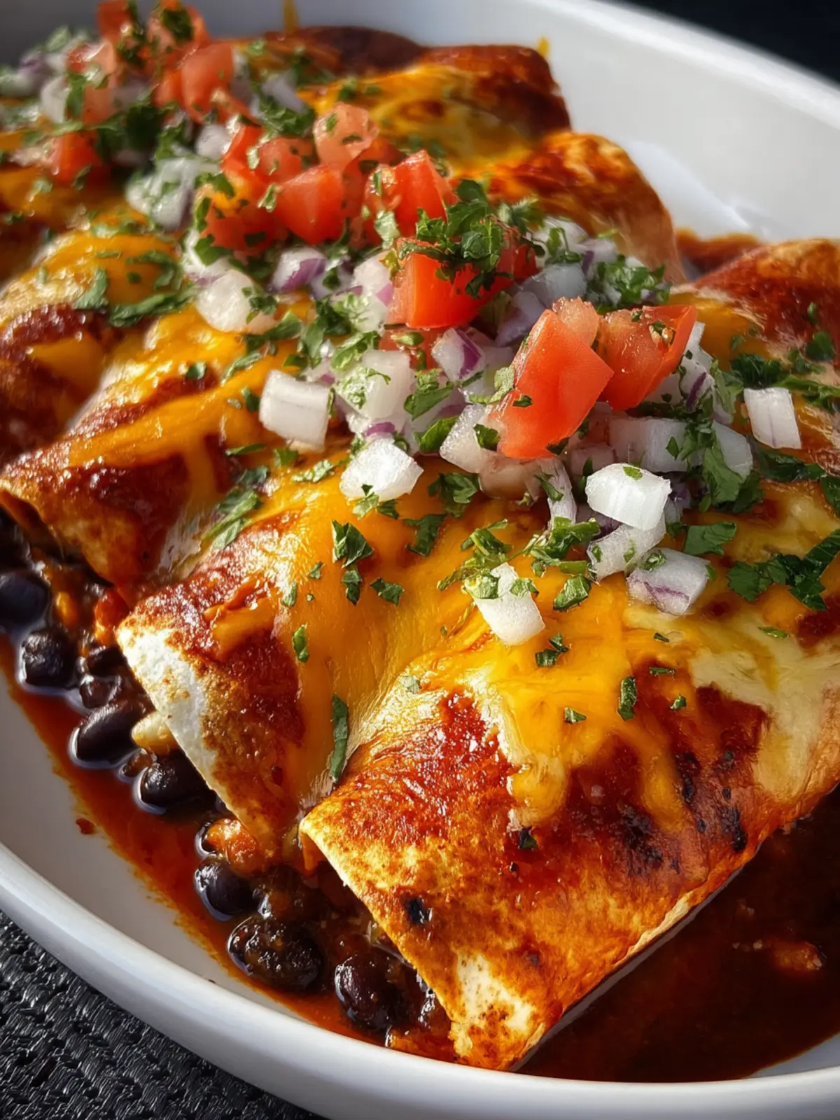 Delicious black bean enchiladas topped with cheese and enchilada sauce, perfect for a quick dinner.