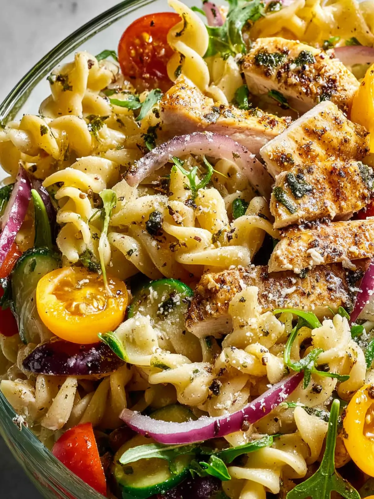 - Transfer the chicken along with any accumulated juices to the pasta bowl. Add the Yellow Bell Pepper (chopped), Red Onion (diced), Cherry Tomatoes (halved), Green Olives (halved), Ground Parmesan Cheese, and Arugula.