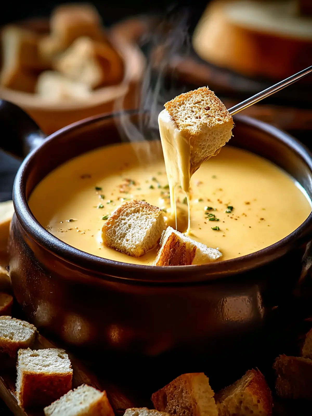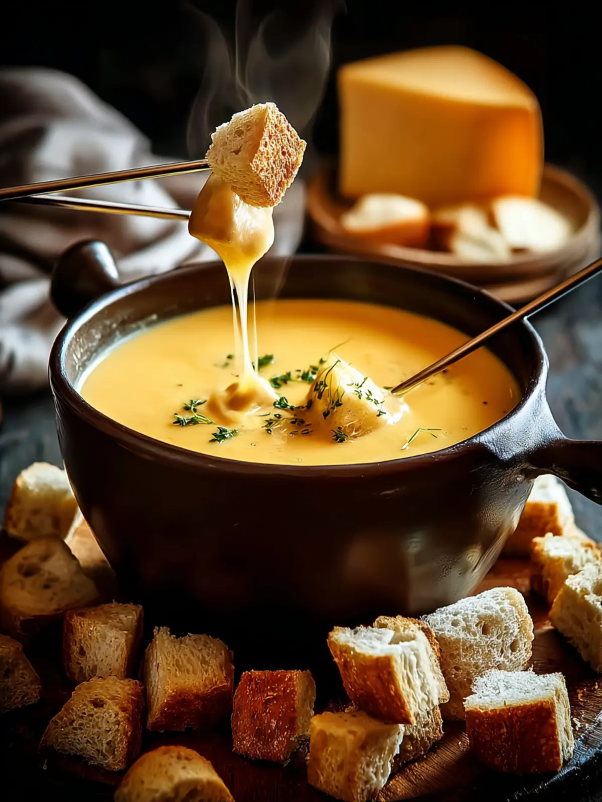 - Bread: Crusty baguette cubes or pretzel bread are perfect.