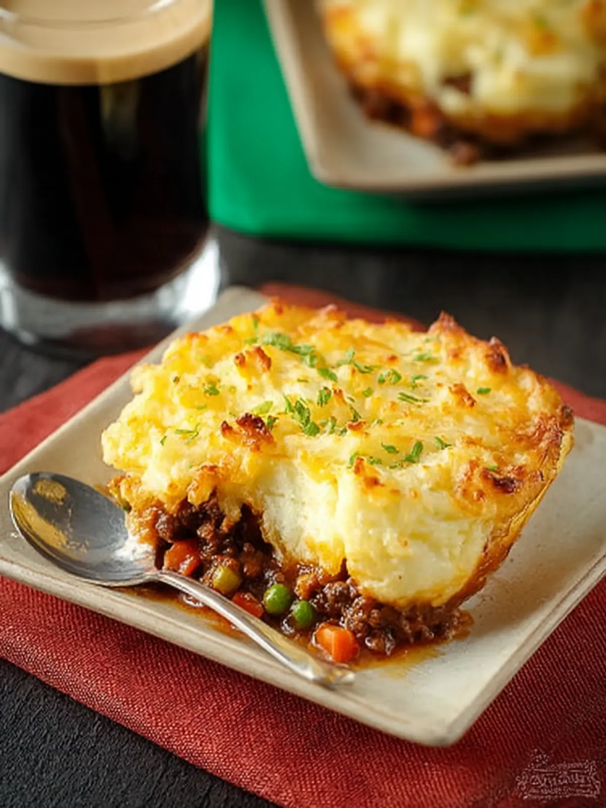 - Savory Lamb or Beef: Ground lamb or beef provides a depth of flavor that pairs beautifully with the stout. This dish is about balance: the meat’s richness meets the creamy, buttery mashed potatoes.