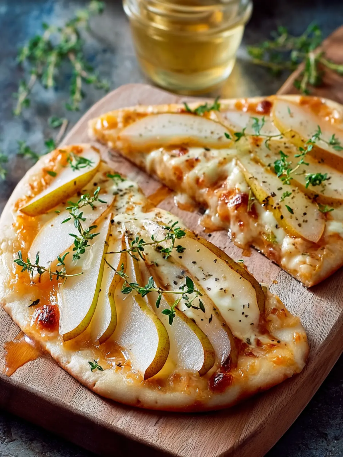 This delicious Brie and Pear Flatbread is a perfect appetizer or snack that combines creamy brie with sweet pears and honey.