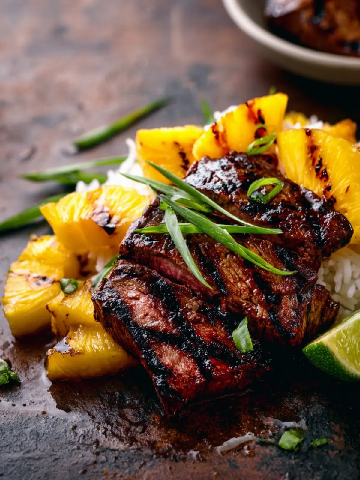 A delicious dish featuring flank steak marinated and grilled to perfection, served with coconut basmati rice and grilled pineapple.