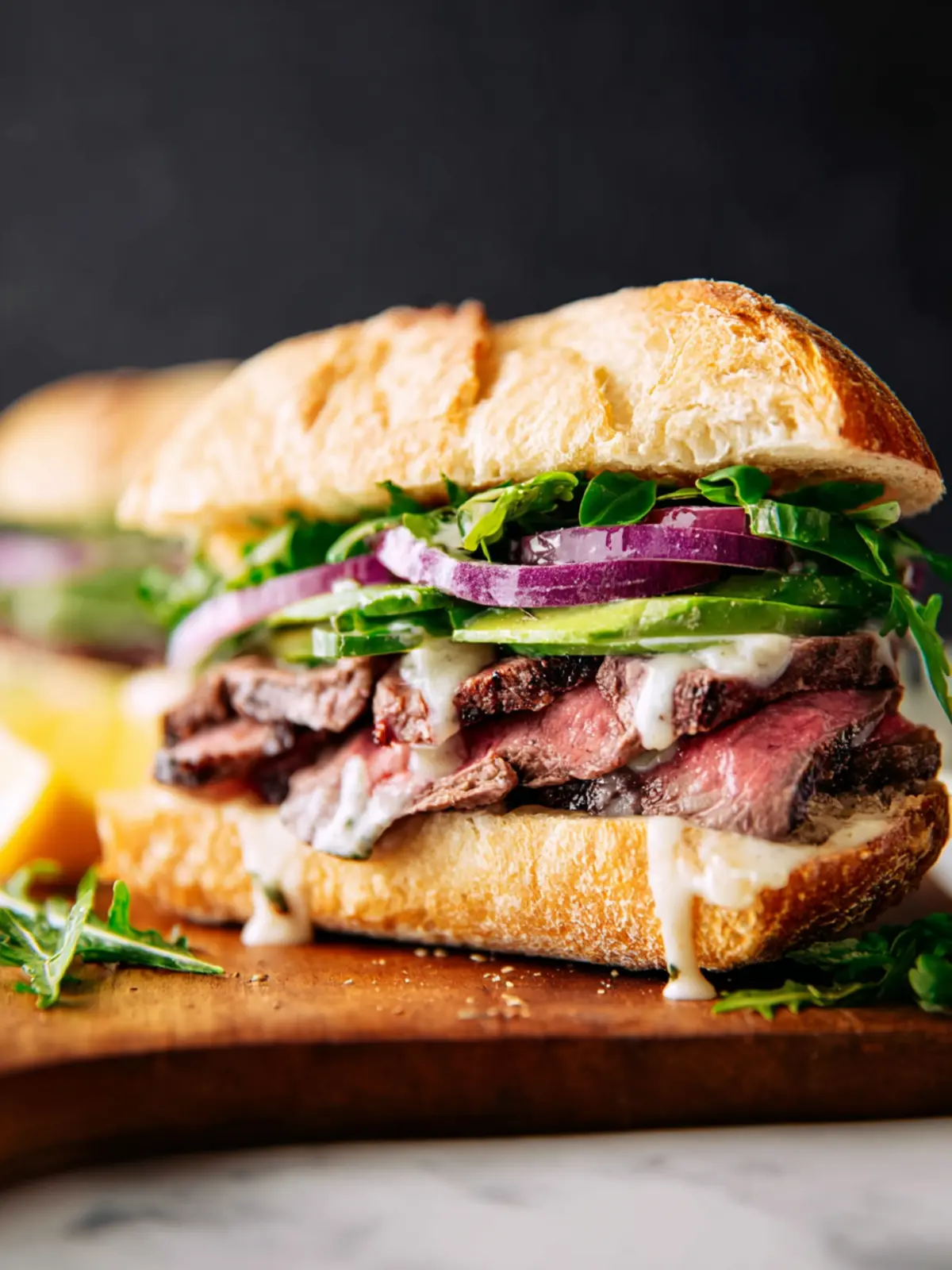 - Assemble: Toast the ciabatta rolls. Spread aioli generously on the inside of both halves. Layer the bottom with arugula, avocado, sliced steak, and pickled onions. Close the sandwich and serve right away.